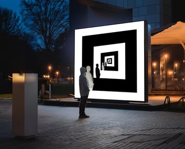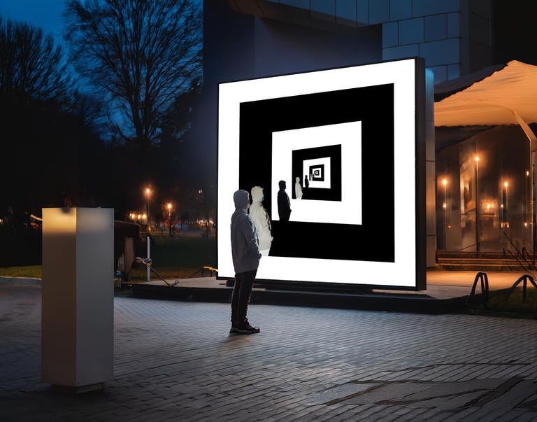 By standing before the screen, the viewer’s identity becomes fragmented, multiplying into a complex interplay of presence and absence. This dynamic mirrors the experience of navigating digital spaces, where our online personas are fractured, duplicated, and projected indefinitely.